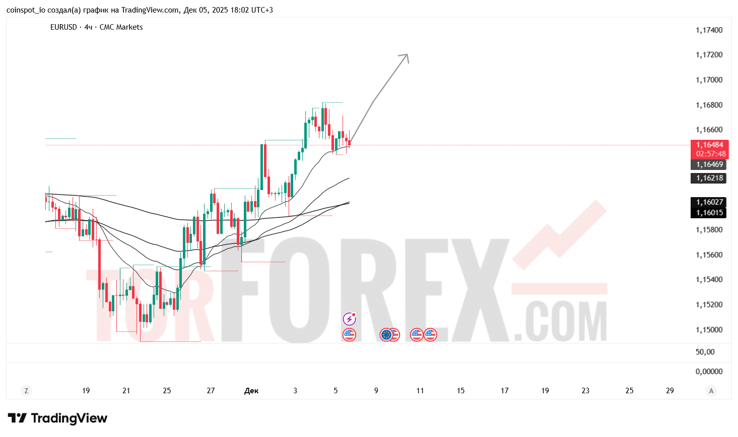 Торговая пара EUR/USD завершает сессию 5 декабря на отметке 1.16514 USD, прибавив 0.06%. После импульсного роста к 1.1685 USD наблюдается консолидация в узком диапазоне. На 4-часовом графике цена удерживается над ключевыми скользящими средними, что подтверждает сохранение восходящего импульса. Доллар остаётся под давлением на фоне ожиданий по ставкам, а евро демонстрирует устойчивость вблизи локальных максимумов.