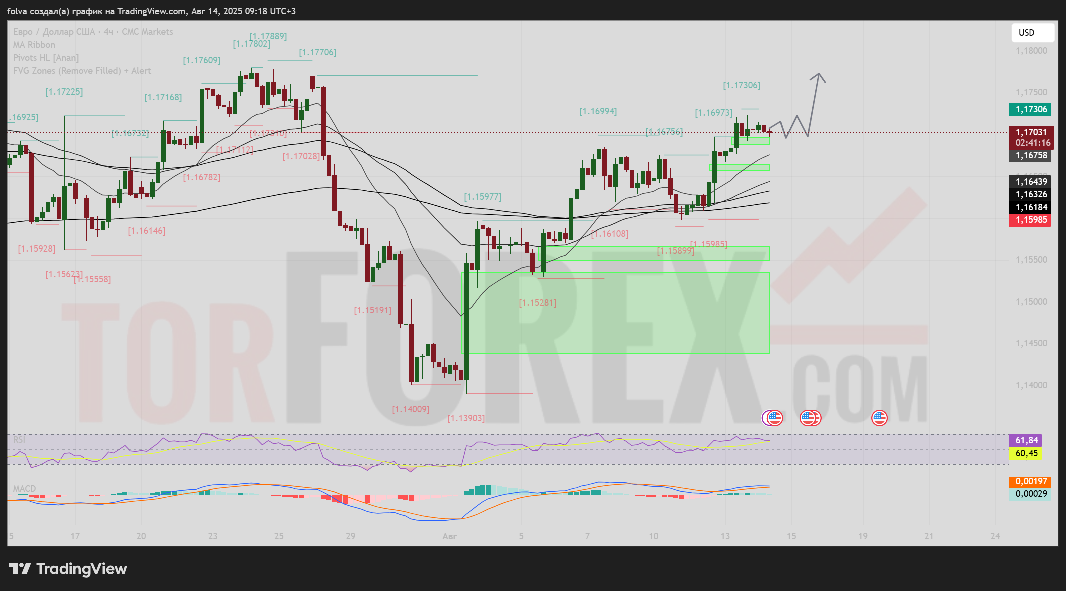 Техническая картина по EUR/USD остаётся бычьей, но признаки замедления импульса требуют осторожности при входе в покупки. Основная идея — искать длинные позиции при удержании 1.1705–1.1676 с целями 1.1760 и 1.1788. Стоп-лосс целесообразно размещать ниже 1.1650.