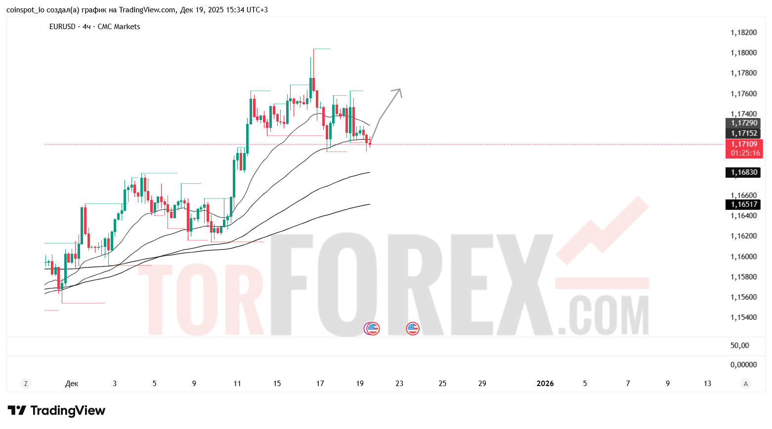 На 20 декабря 2025 года EUR/USD демонстрирует признаки консолидации с потенциалом к росту. Основной сценарий — движение к 1.17500–1.17700 USD при пробое сопротивления. Альтернативный сценарий — снижение к 1.16700–1.16500 USD при отказе от уровня 1.17350 USD.