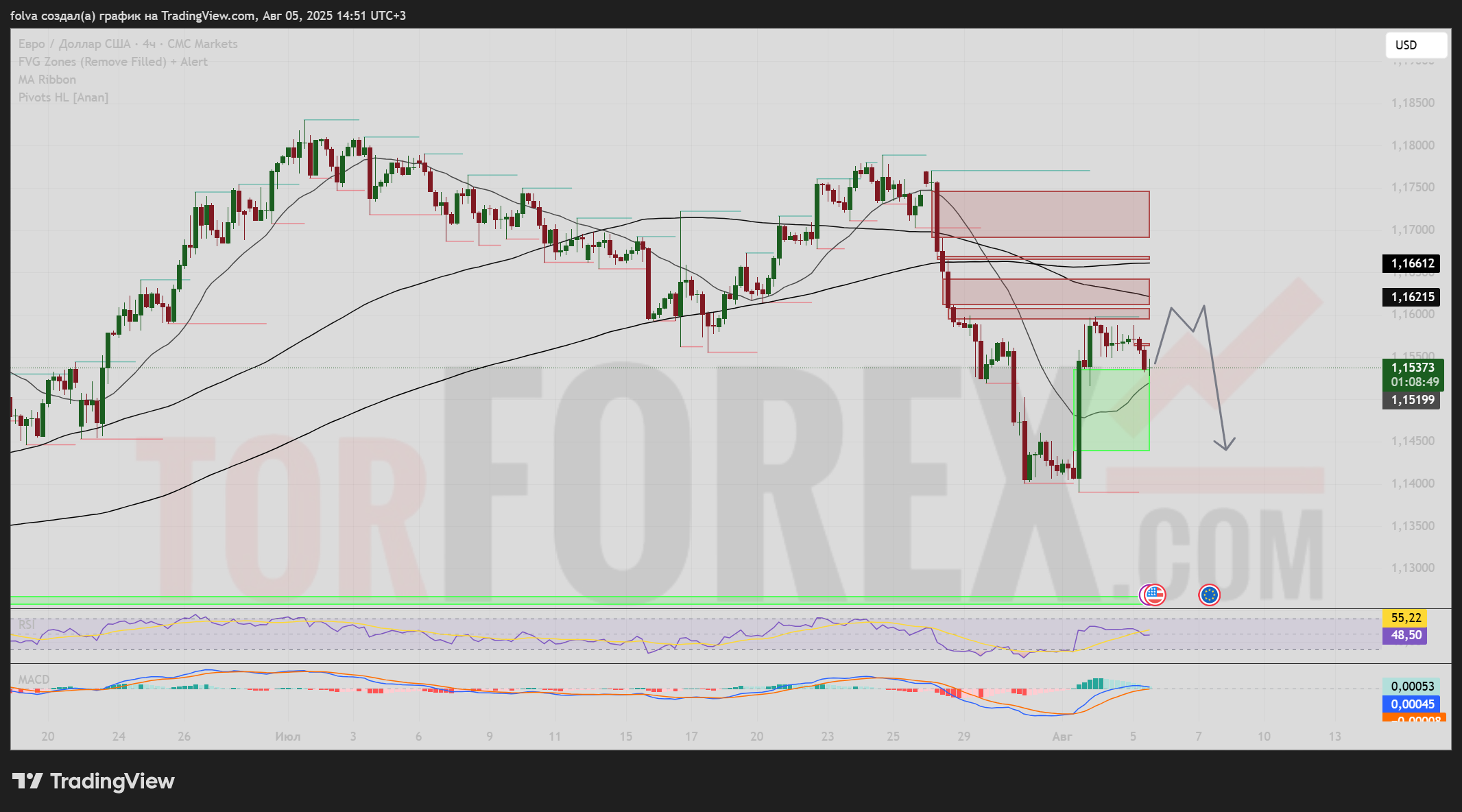 Если цена не сможет вернуться выше зоны 1.1550–1.1600 и закрепиться там, вероятно продолжение нисходящего движения. Подтверждение сценария — пробой уровня 1.1510 и закрепление ниже него. В этом случае следующими целями могут стать: