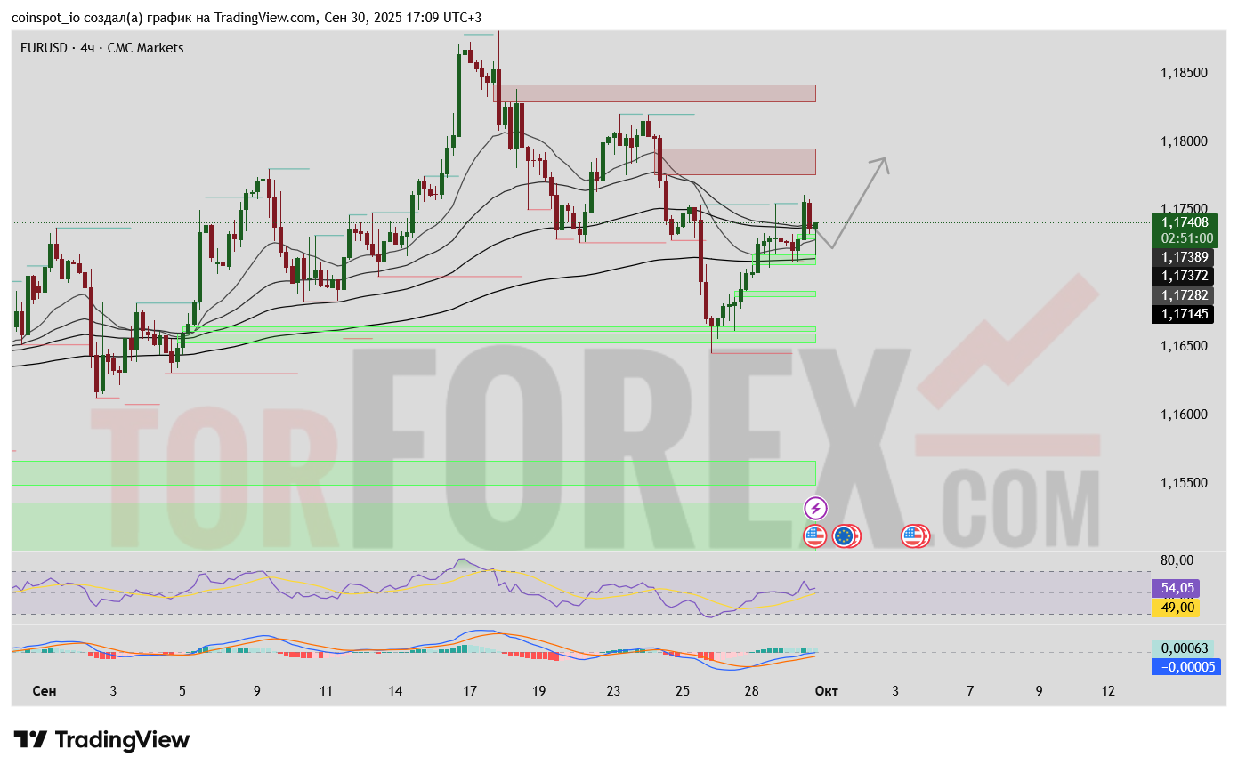 Котировка закрылась в районе 1.17299, оказавшись выше значимого уровня 1.17271. Текущее положение цены относительно EMA Ribbon (20/50/100/200) показывает попытку быков развить восстановление, однако общая структура сохраняет элементы хрупкого баланса. Ключевое сопротивление формируется на уровне 1.17853, совпадающим с локальным максимумом. Дополнительным барьером выступает зона 1.18000, где сосредоточены психологические уровни. Со стороны поддержки критическим уровнем является отметка 1.17144, пробой которой может спровоцировать возобновление нисходящего движения. На графике отмечаются FVG-зоны, которые могут выступать дополнительными ориентирами для ценового движения.