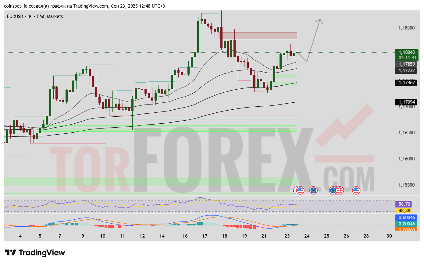 Торговая пара EUR/USD демонстрирует уверенное восстановление после недавнего снижения. После нахождения сильной поддержки в районе 1.1746, покупатели перехватили инициативу, что привело к активному росту. На 23 сентября цена вернулась выше ключевых скользящих средних и на момент анализа торгуется на отметке 1.18033. Текущая техническая картина указывает на возобновление бычьего импульса и попытку штурма ближайших уровней сопротивления.