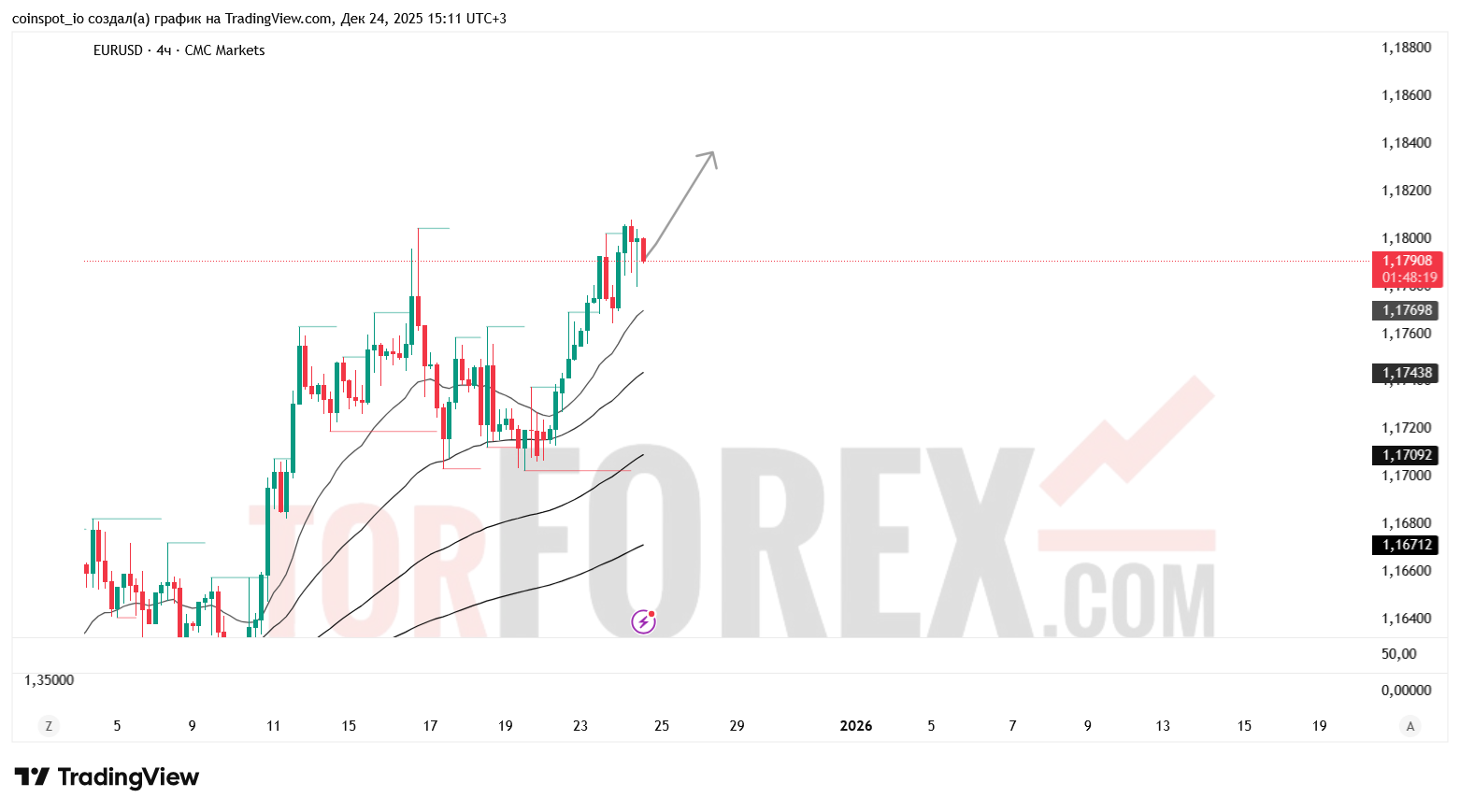 Торговая пара EUR/USD завершает 4-часовую сессию на отметке 1.17904 USD, с незначительным снижением –0.03%. После импульсного роста к 1.1810 USD инструмент демонстрирует консолидацию в узком диапазоне. На графике наблюдается удержание цены над EMA 100 и EMA 200, что формирует устойчивую бычью структуру. Волатильность снижается, объёмы остаются стабильными — рынок готовится к направленному движению в праздничной низколиквидной среде.