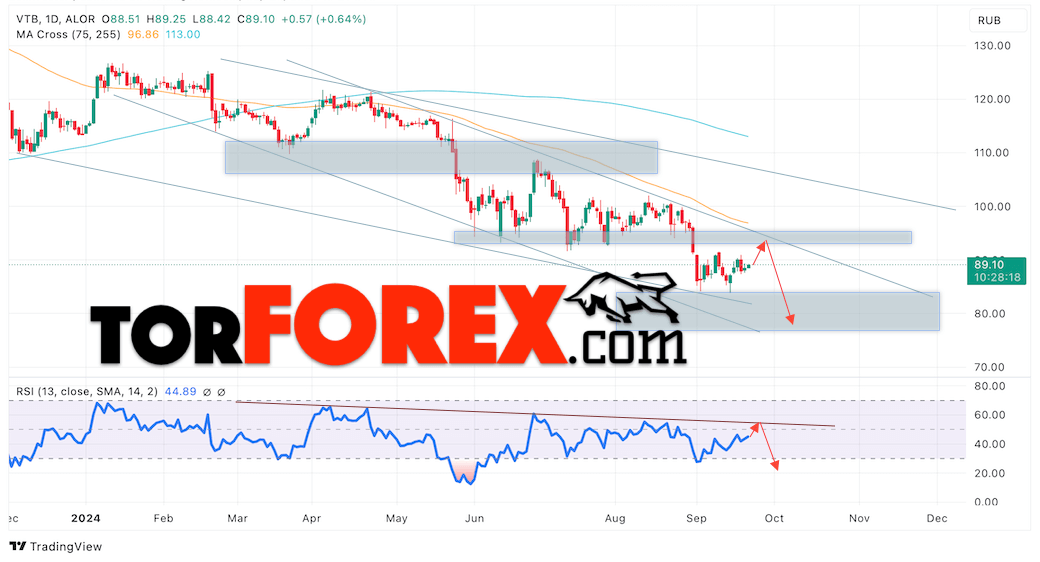 Котировки акций VTBR торгуются на уровне 89.10. Бумага продолжает движение в рамках развития коррекции и медвежьего канала. Скользящие средние указывают на наличие нисходящей тенденции по акциям компании. Цены пробили область между сигнальными линиями вниз, что указывает на давление со стороны продавцов акций и потенциальное продолжение развития нисходящей тенденции. В рамках прогноза курса и стоимости Банк ВТБ на торговую неделю на 23 — 27 сентября 2024 стоит ожидать попытку развития восходящей коррекции и тест уровня сопротивления на отметке 93.05. Откуда стоит рассматривать отскок вниз и продолжение падения курса акций с целью ниже уровня 79.05.