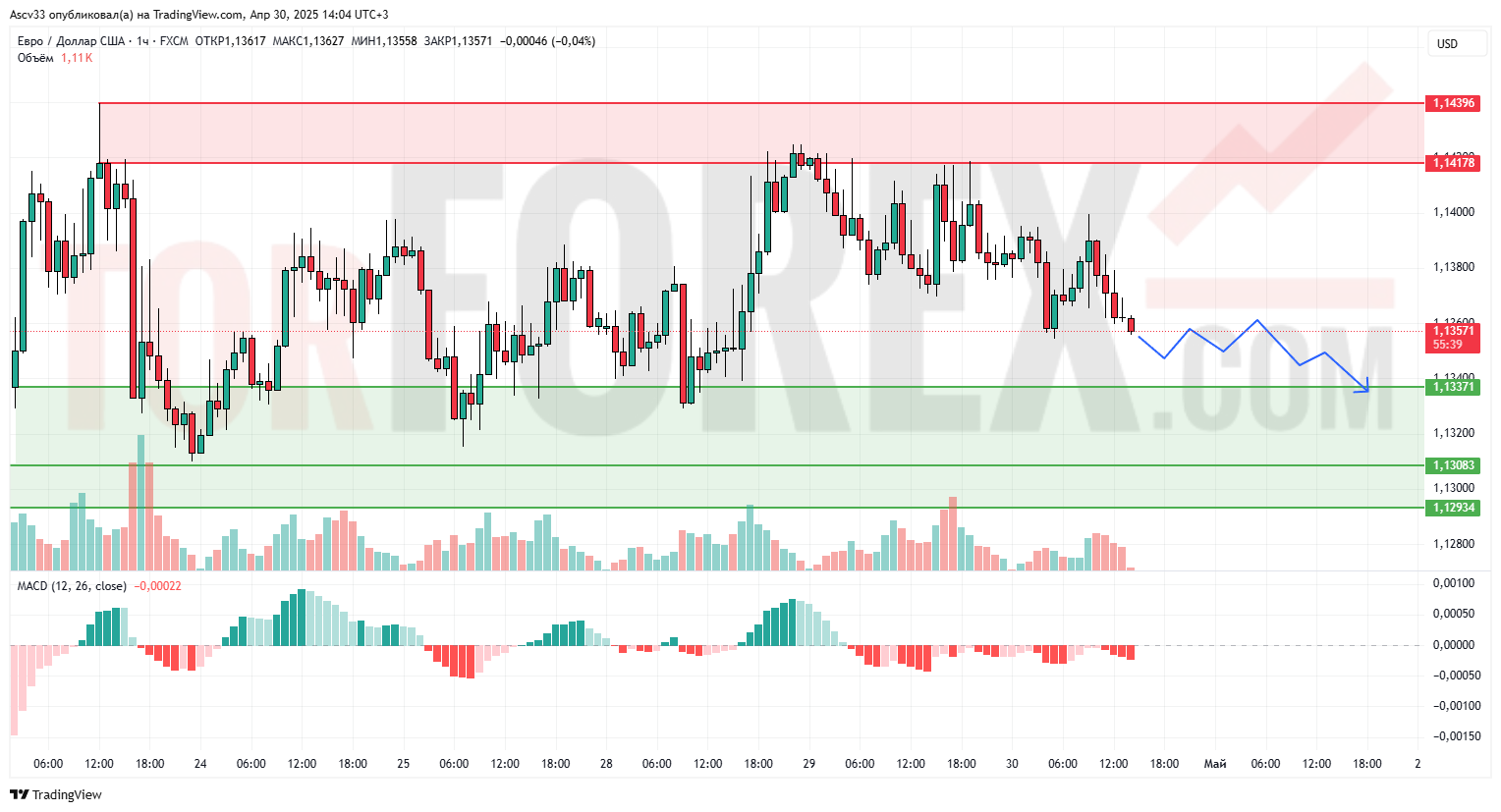 Вероятно постепенное движение к зоне поддержки 1.13371. При пробое — снижение к 1.13080 и ниже. Сценарий роста возможен только при закреплении выше 1.1400.