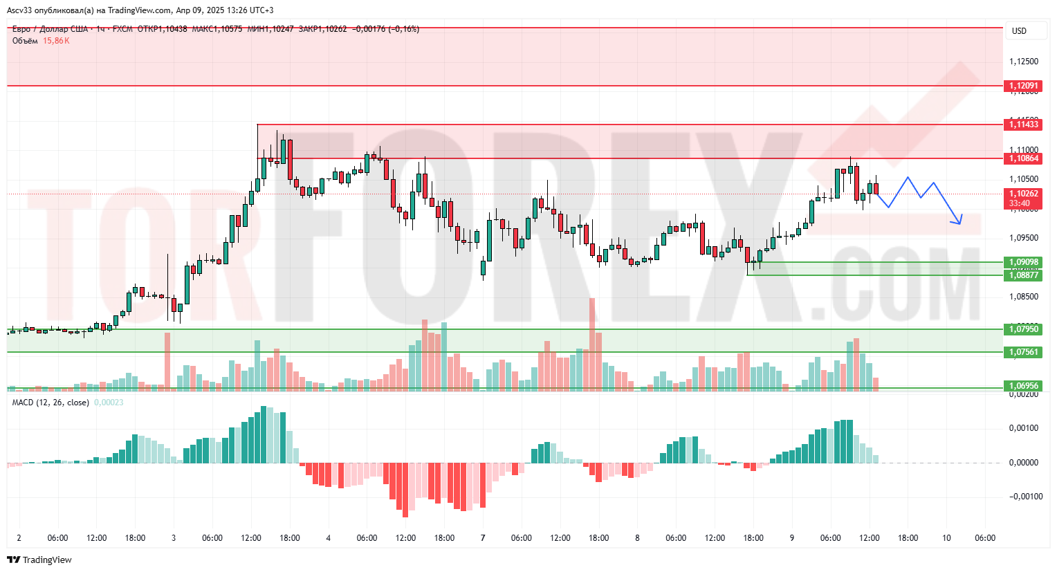 Пара EUR/USD торгуется в зоне локального сопротивления после восходящего импульса, достигнув уровня 1,1086. На часовом графике наблюдается замедление роста и формирование потенциального отката, что указывает на ослабление покупательского импульса.