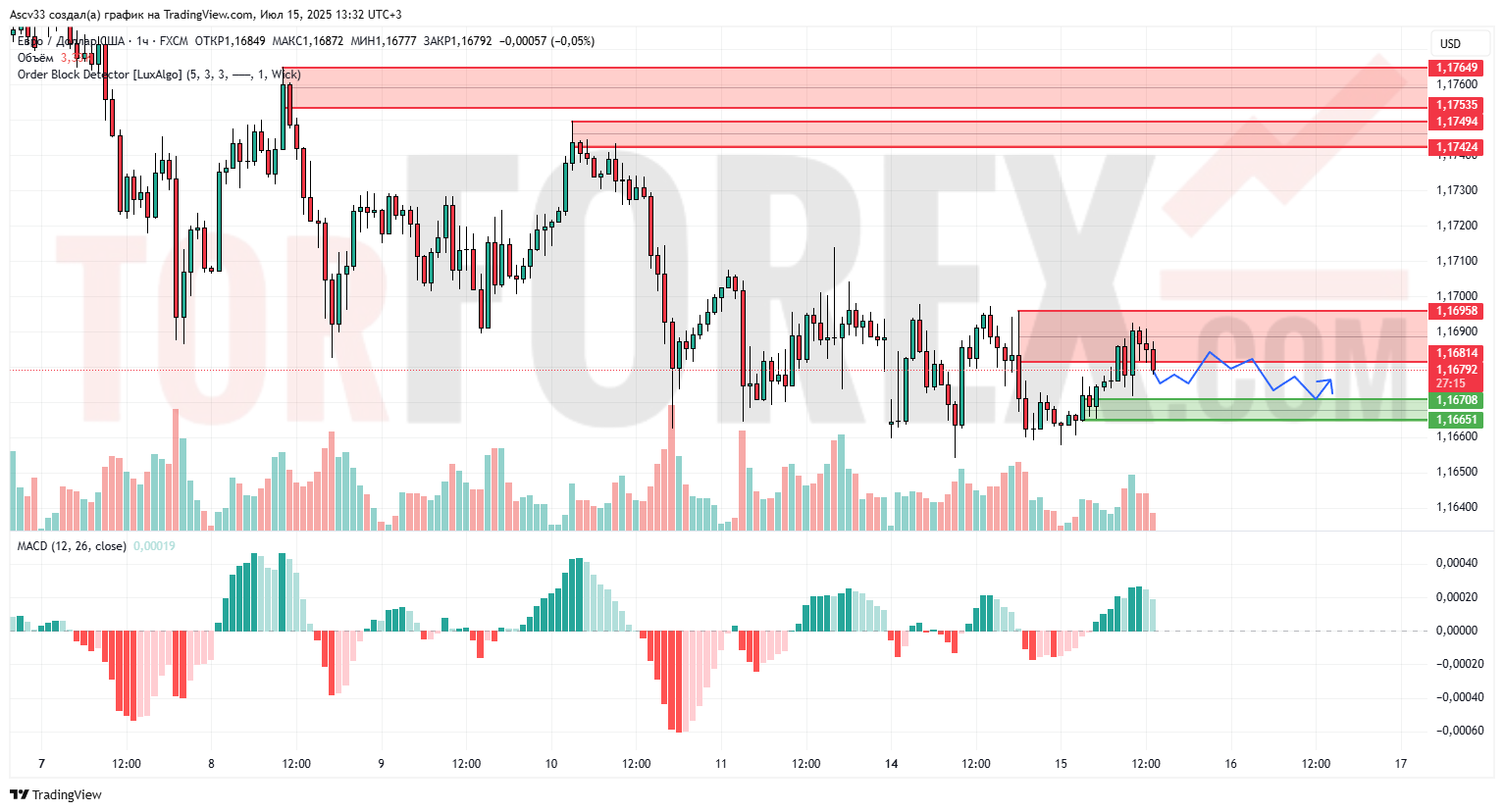 1,16708–1,16651 — ближайшая область, где ранее фиксировались объёмы и происходил отскок. Её пробой усилит давление на пару и откроет путь к более глубокой зоне снижения.