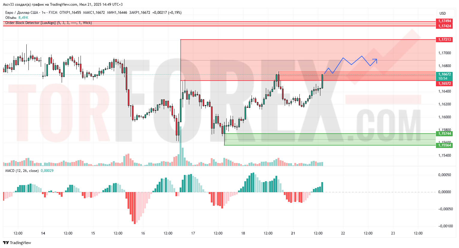 EUR/USD, вероятно, продолжит движение внутри зоны 1,16572–1,17213 с потенциалом пробоя вверх и целью в районе 1,17400. В случае локальной коррекции поддержка находится в диапазоне 1,15744–1,15600.