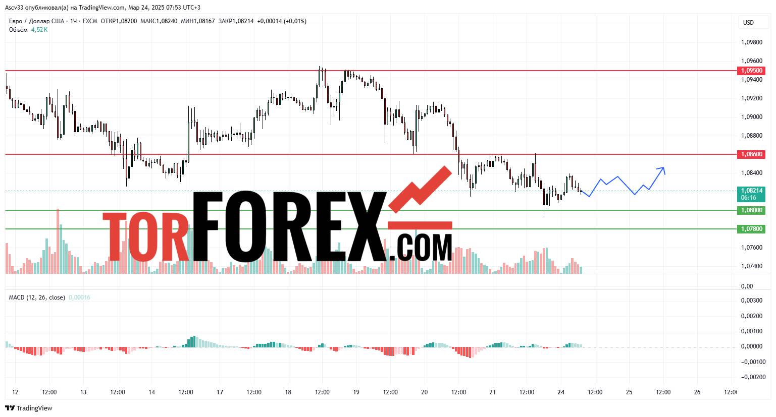 Ожидается, что EUR/USD останется в пределах 1.0780–1.0860 на 24 марта. Пробой 1.0860 вверх подтвердит восходящие тенденции, в то время как закрытие ниже 1.0800 может усилить медвежьи настроения. Трейдерам рекомендуется внимательно следить за изменениями курса вблизи этих ключевых уровней, так как их прорыв может оказать значительное влияние на дальнейшую траекторию валютной пары.