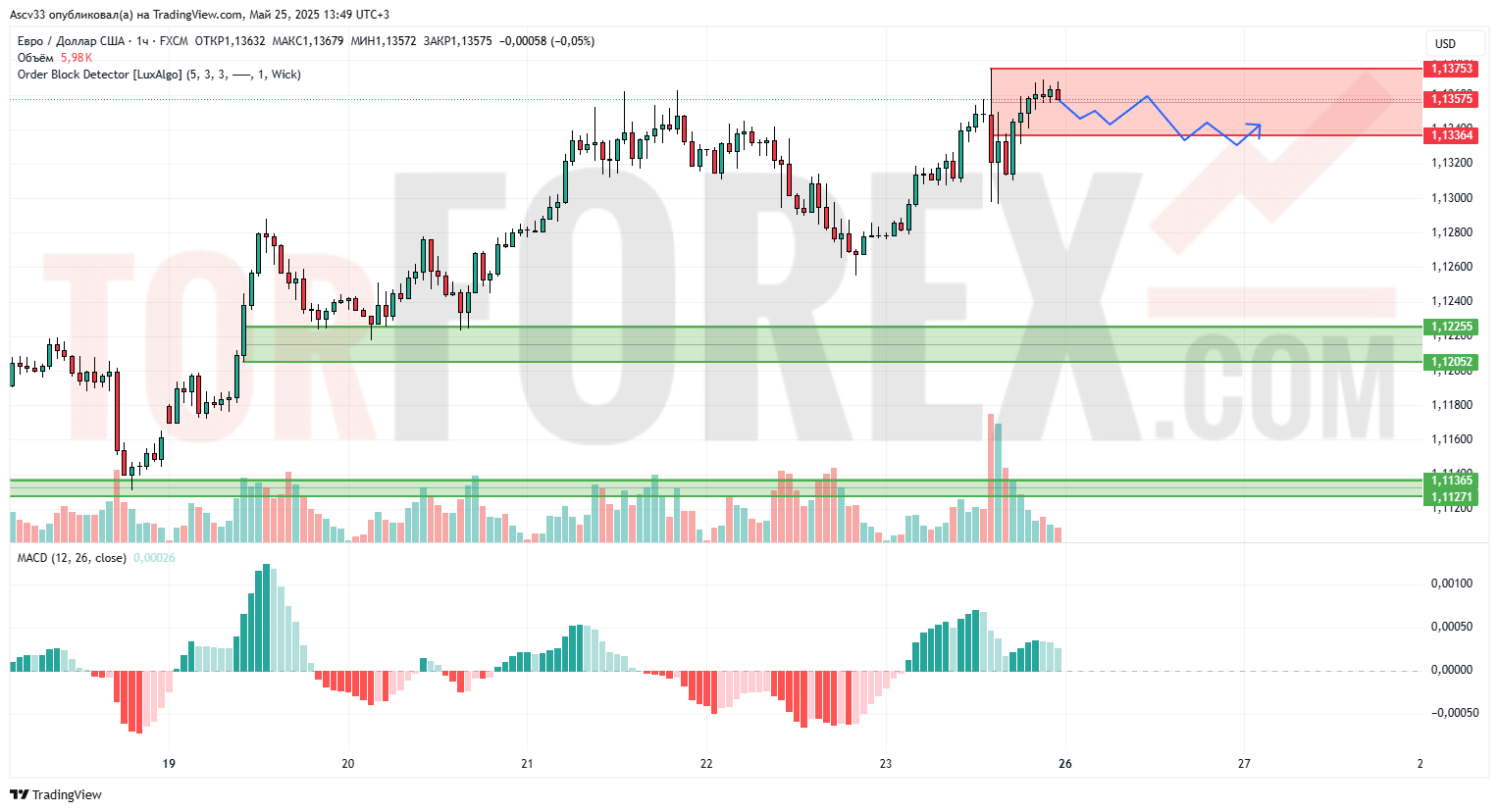 - 1,13394 — 1,13753 — ближайшая зона сопротивления, в которой находится текущая цена. Прорыв выше 1,13753 откроет путь к дальнейшему росту.