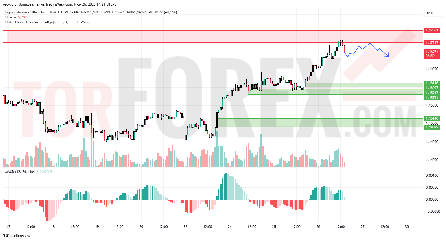 Пара EUR/USD демонстрирует локальную коррекцию после стремительного роста и тестирования зоны сопротивления. На часовом графике видно формирование локального максимума в районе 1,17217, за которым последовал откат. Объёмы начали снижаться, указывая на возможное ослабление покупательского давления.