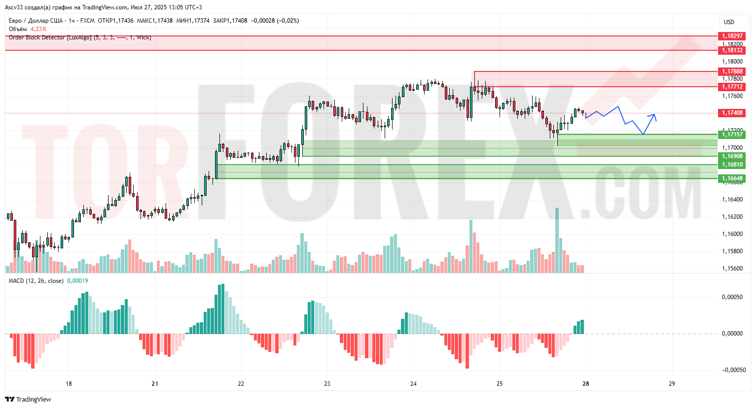 При удержании выше 1.17157 пара EUR/USD может продолжить восстановление в направлении 1.17712 – 1.17888. Однако, пока нет подтвержденного пробоя сильных сопротивлений, основным сценарием остается флэт с возможным уклоном вверх в краткосрочной перспективе. Дальнейшее развитие будет зависеть от способности пробить и закрепиться выше указанных зон сопротивления.