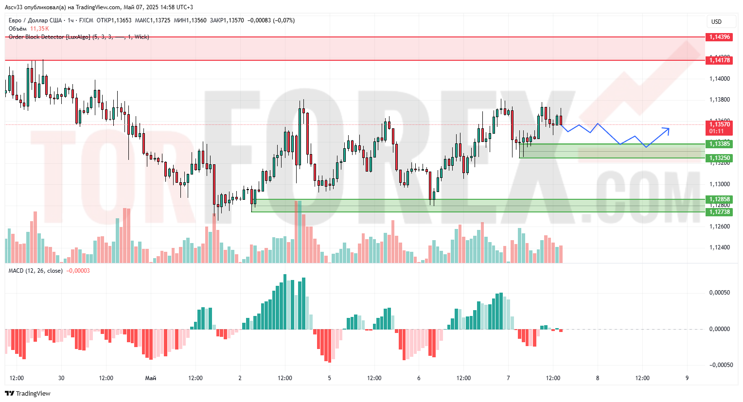 Пара EUR/USD демонстрирует умеренную восходящую динамику после теста зоны поддержки 1,1274–1,1288. Сейчас цена закрепилась выше 1,1338 и тестирует верхнюю часть диапазона. MACD показывает ослабление покупательского импульса, что может привести к локальной коррекции перед новым ростом.