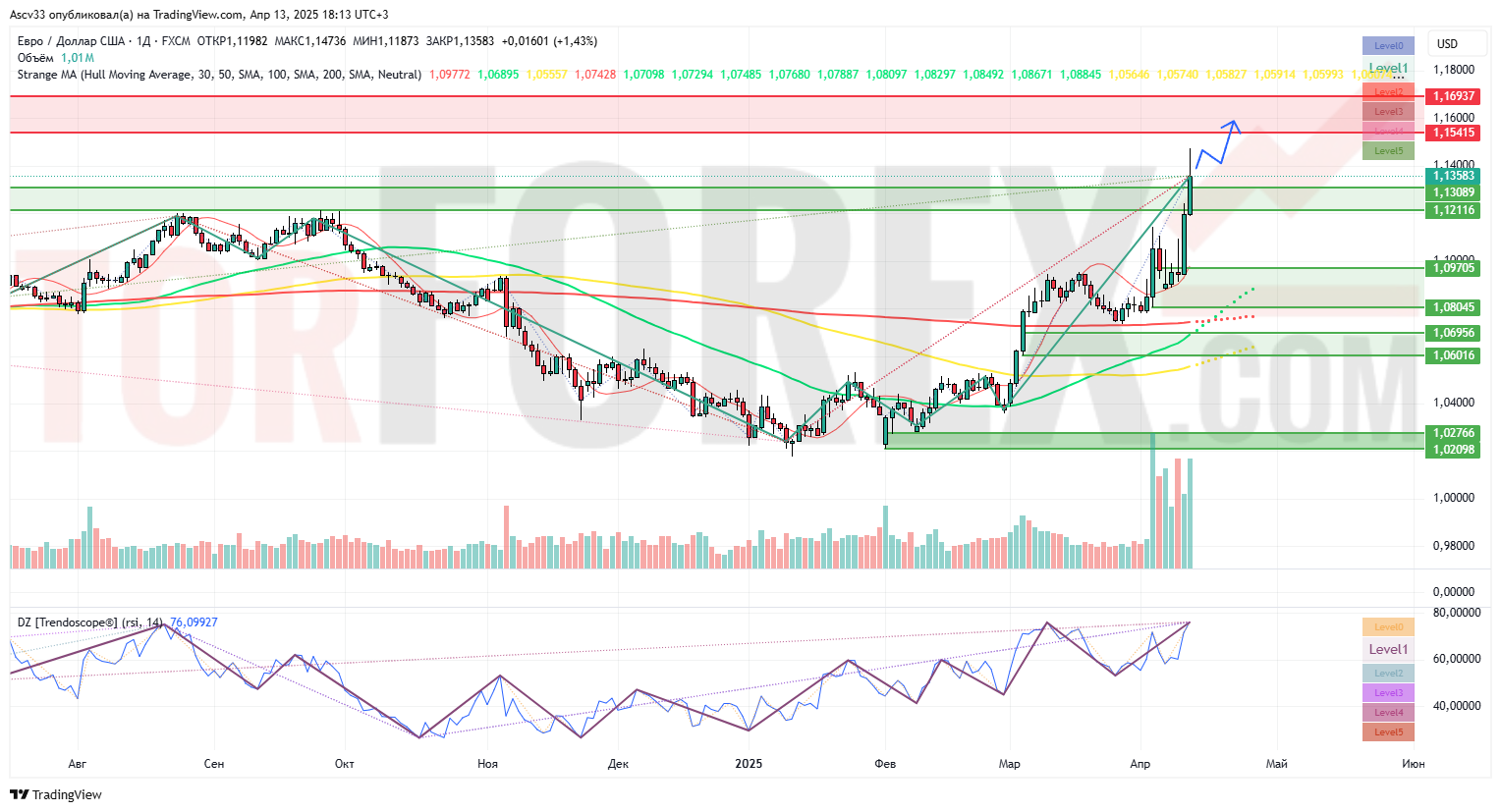 Если покупатели удерживают выше 1.1300, возможно продолжение роста в зону 1.1540–1.1600, после чего вероятен откат к 1.1300 на фоне перекупленности.