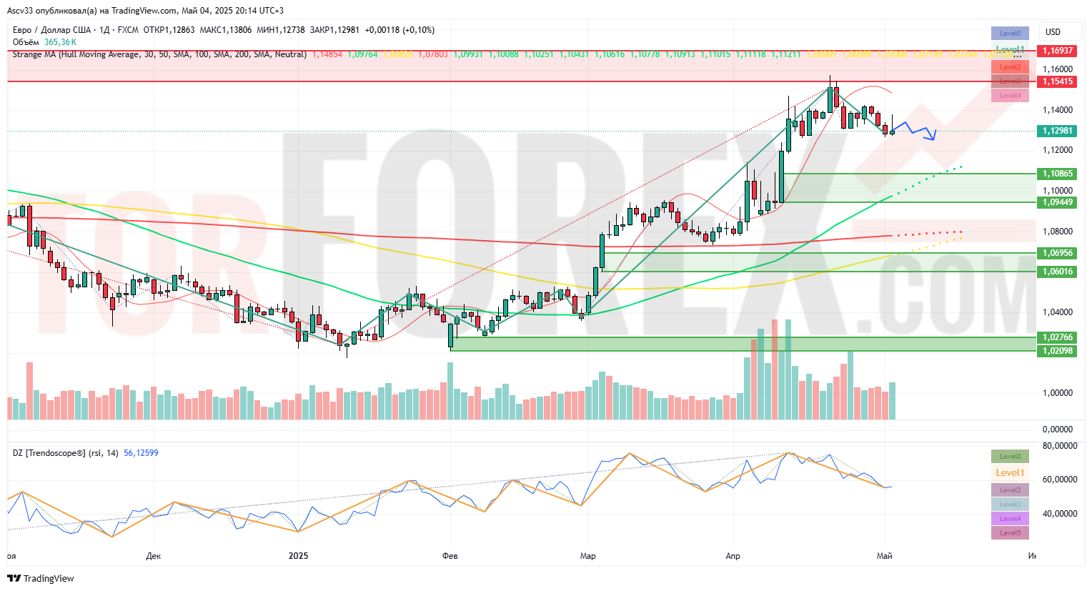 На фоне сильного импульса в апреле торговая пара EUR/USD демонстрирует признаки коррекции от области сопротивления 1.1540–1.1600. Цена формирует структуру замедления восходящего движения, что может указывать на начало фазы консолидации либо более глубокой коррекции.