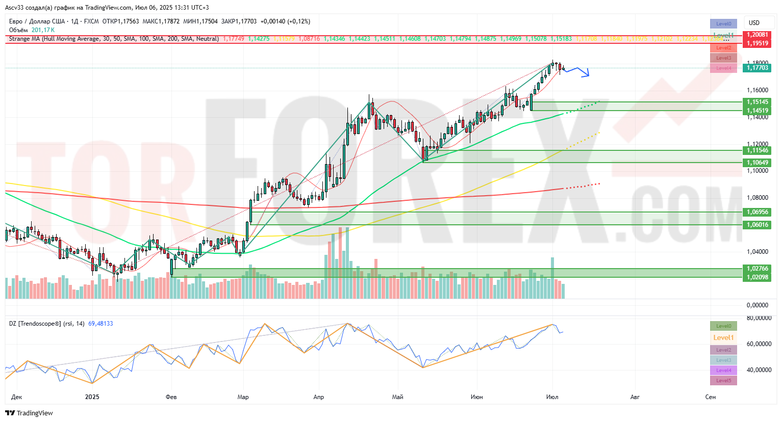 Пара EUR/USD находится в фазе замедления роста после уверенного восходящего тренда. Ближайшая цель быков — пробой уровня 1.1800 с последующим движением к 1.1950. Однако наличие перекупленности по RSI и тест важного сопротивления создают условия для краткосрочной коррекции.