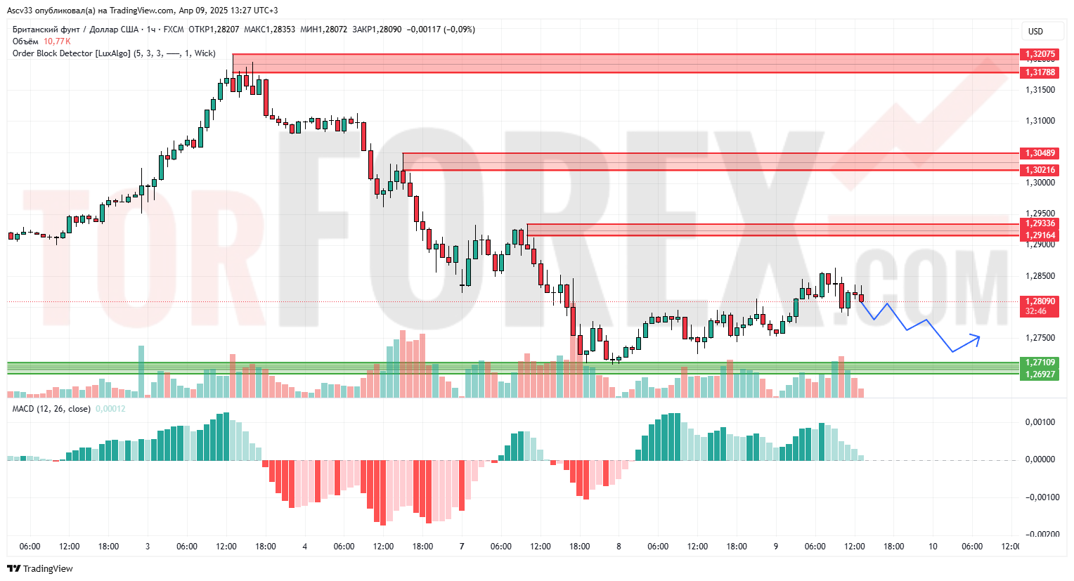 Пара GBP/USD остаётся под давлением после неудачной попытки закрепления выше зоны предложения на 1,2846–1,2916. На часовом графике наблюдается плавный откат вниз после локального восстановления, что сигнализирует о возможном продолжении нисходящей коррекции.