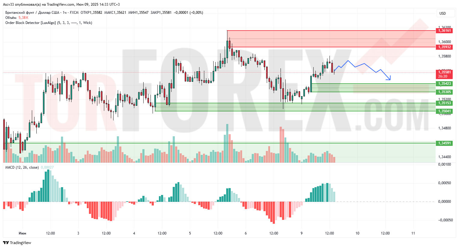 • 1,3593–1,3611 — сильная зона предложения, подтверждённая предыдущим разворотом.