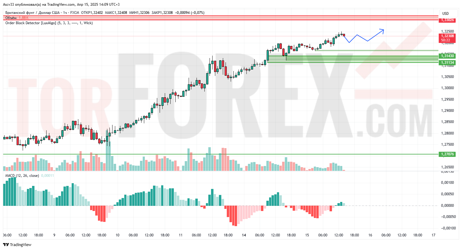 Пара GBP/USD продолжает уверенное восходящее движение, пробив ключевые сопротивления, и закрепилась выше уровня 1.3200. На текущий момент цена консолидируется вблизи локальных максимумов, демонстрируя устойчивость восходящего импульса. Объёмы остаются стабильными, а индикатор MACD пересёк нулевую линию вверх, что подтверждает позитивный настрой рынка.