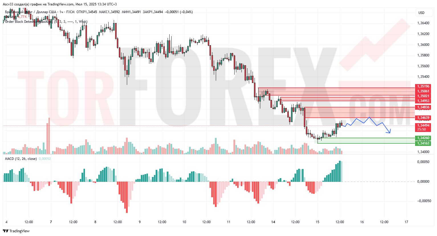 1,34260–1,34163 — ближайшая зона покупателей. Её пробой приведёт к ускорению снижения и усилит давление на пару.