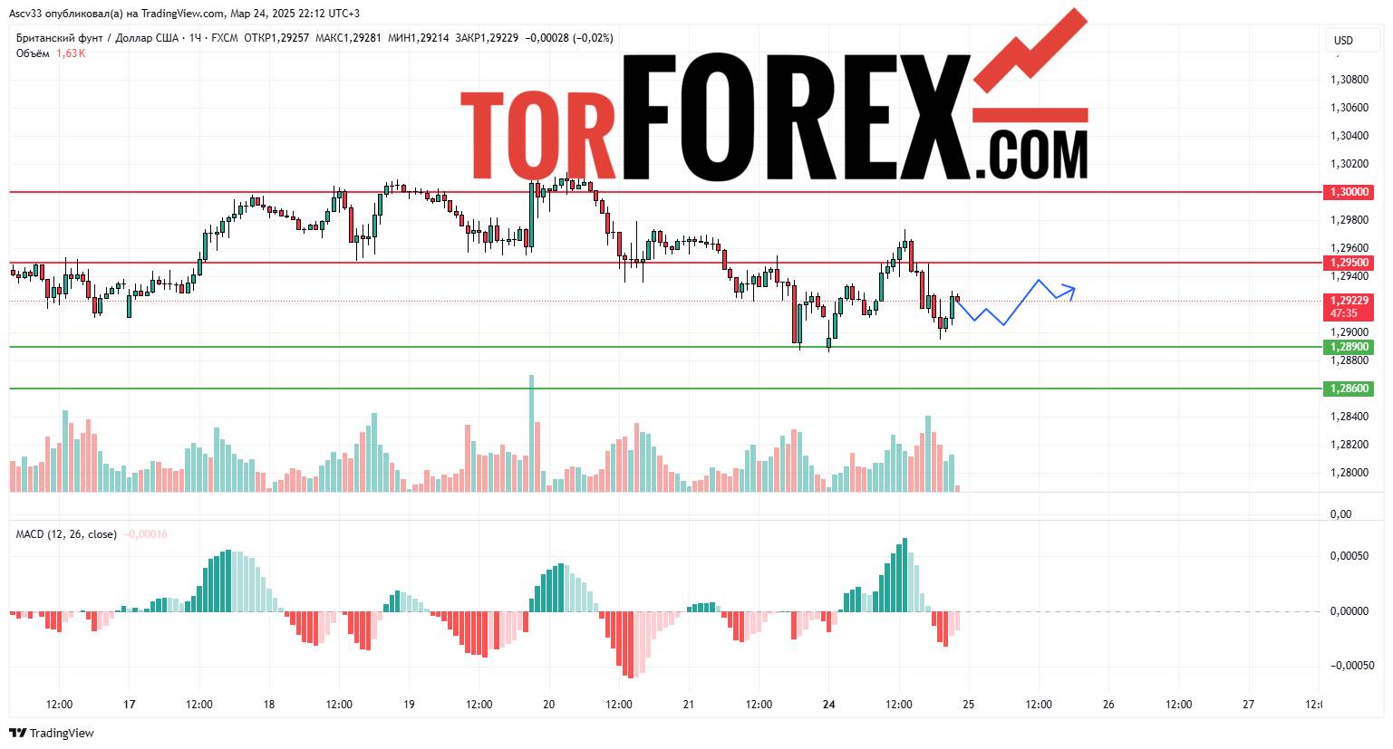 Ожидается, что GBP/USD останется в диапазоне 1,2860–1,2950 25 марта. Пробой 1,2950 вверх подтвердит восходящее движение, в то время как закрытие ниже 1,2890 может усилить медвежьи настроения. Трейдерам рекомендуется внимательно следить за колебаниями курса вблизи этих ключевых уровней, так как их прорыв может значительно повлиять на последующие стратегии на рынке.