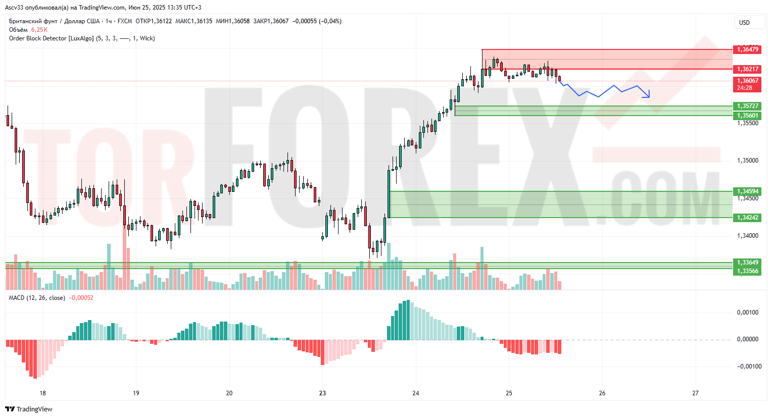 GBP/USD завершил восходящий импульс у зоны сопротивления 1,3621 и перешел в фазу консолидации. Рост замедлился после достижения локального максимума, объёмы постепенно снижаются. Индикатор MACD показывает снижение гистограммы, что может сигнализировать о потере бычьего импульса и возможности коррекции.