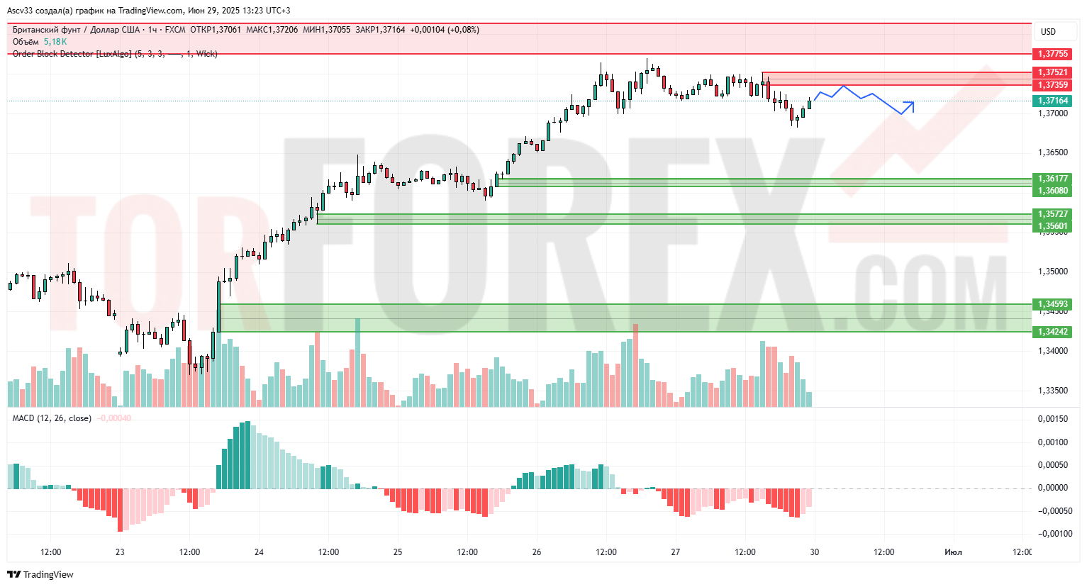 1,37359–1,37521 — актуальная зона предложения, где наблюдается фиксация прибыли. Пробой этой зоны откроет путь к 1,37755.