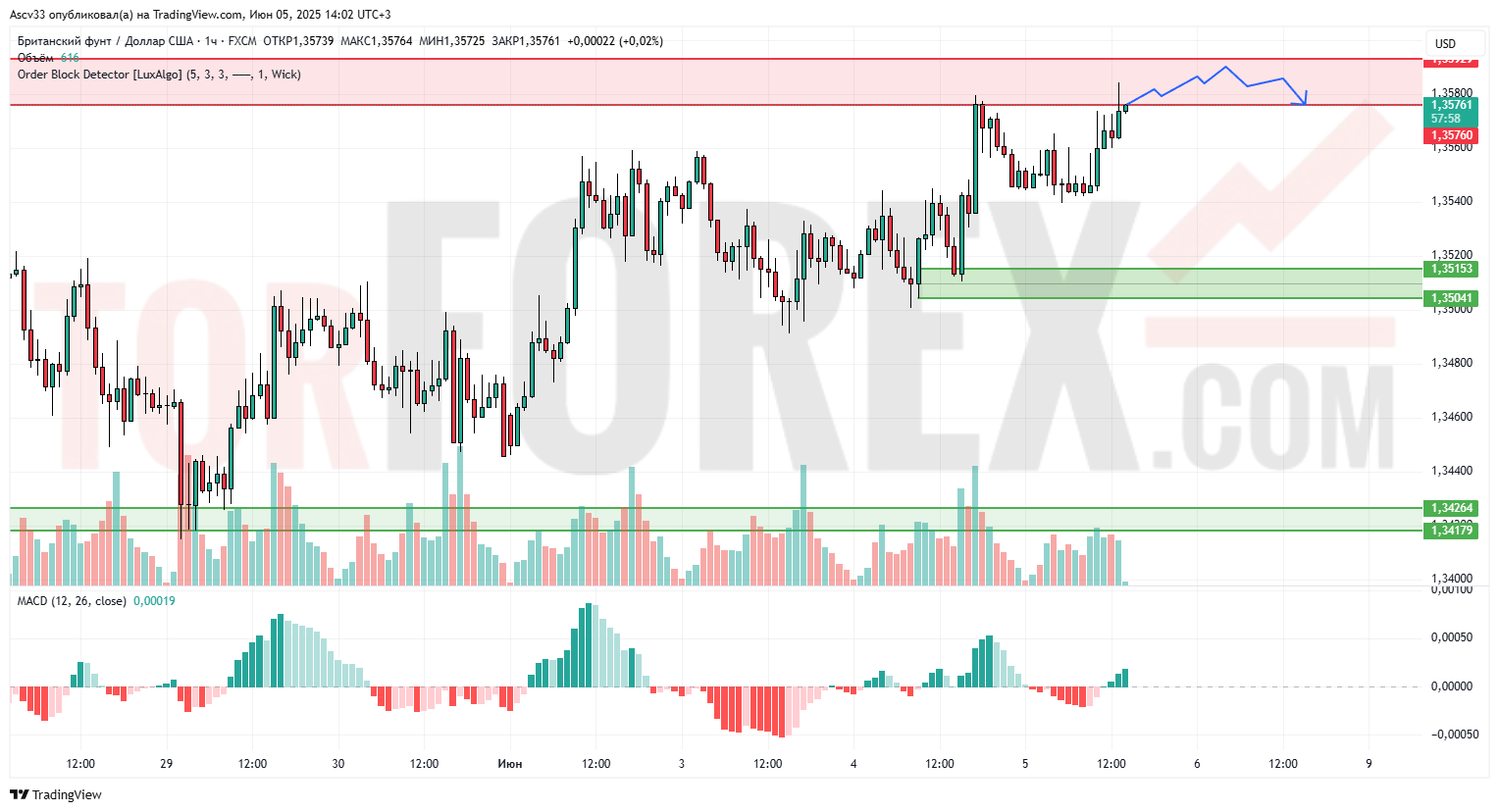 Пара GBP/USD подошла вплотную к зоне сопротивления 1.35760–1.35800, демонстрируя признаки замедления на росте. После нескольких попыток пробоя рынок пока не показывает уверенного продолжения. Объёмы остаются умеренными, индикатор MACD указывает на слабеющий бычий импульс.
