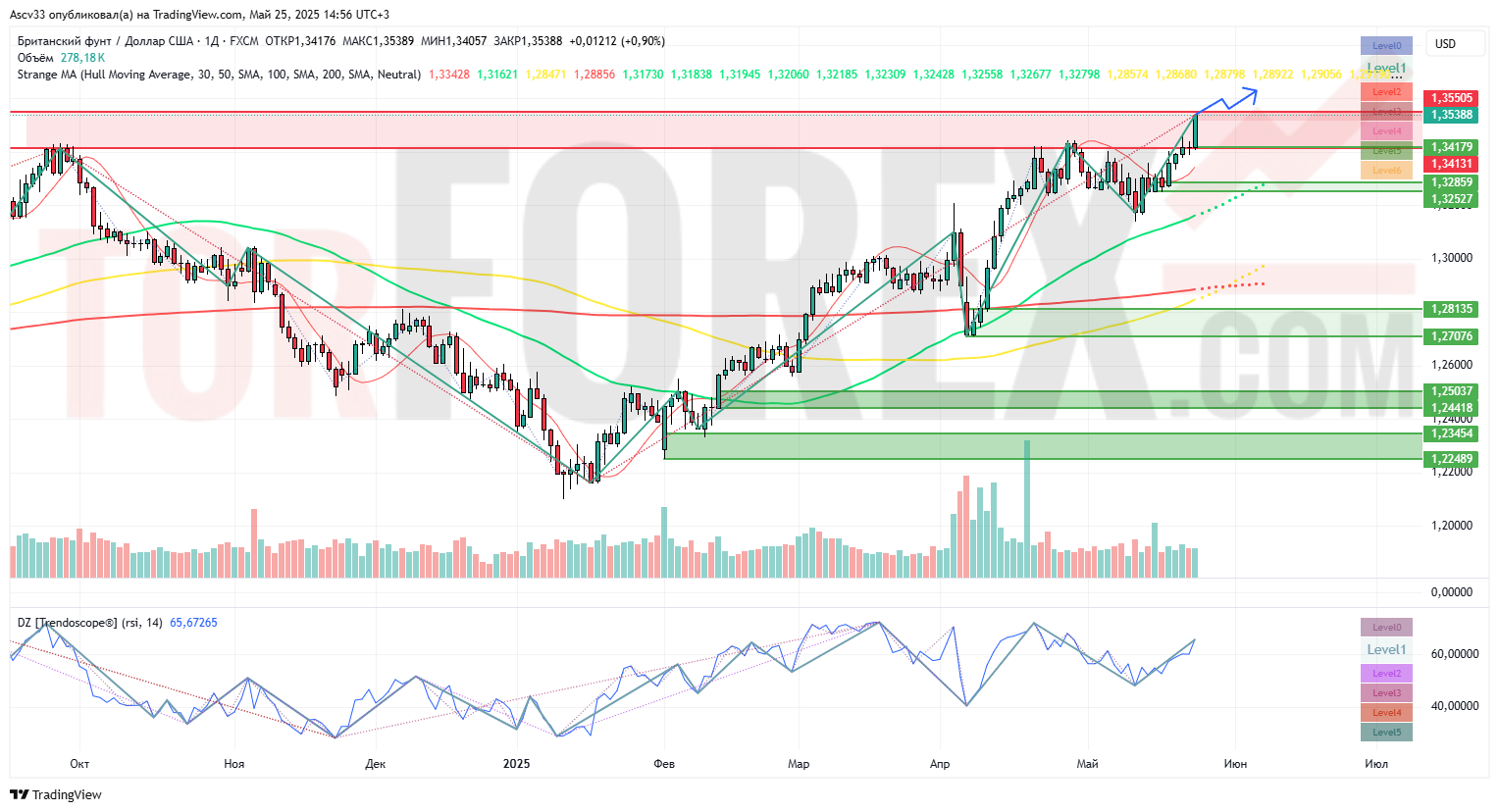 Бычий сценарий: Если покупателям удастся преодолеть и уверенно закрепиться выше текущей зоны сопротивления 1.3550–1.3600 (уровень «Level 1» на графике), это откроет путь к дальнейшему росту. Следующей целью для быков может стать отметка 1.3650 и выше, возможно, с тестированием более высоких исторических уровней. Прорыв и удержание выше текущих максимумов будет сильным подтверждением продолжения восходящего тренда, подкрепленного бычьим расположением EMA. Успешное преодоление этой зоны сопротивления будет говорить о преобладании покупателей и потенциальном ускорении движения.