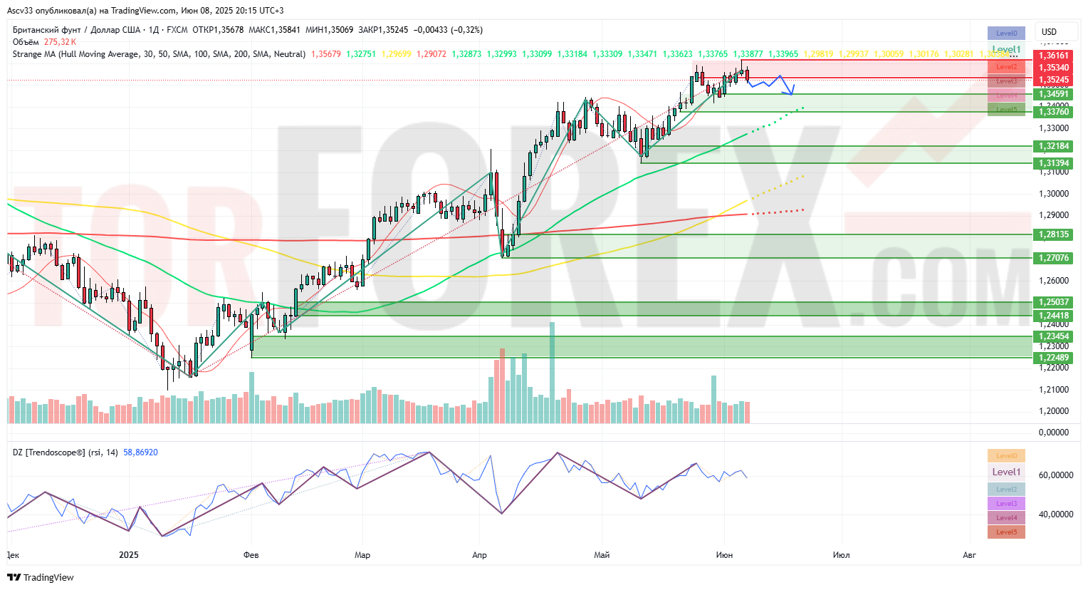 Пара GBP/USD завершила первую неделю июня вблизи ключевого сопротивления, показывая признаки локального ослабления восходящего импульса. Несмотря на уверенный рост в предыдущие недели, текущая динамика указывает на консолидацию и возможную коррекцию. Покупатели проявляют осторожность на подступах к области 1,3535–1,3616.