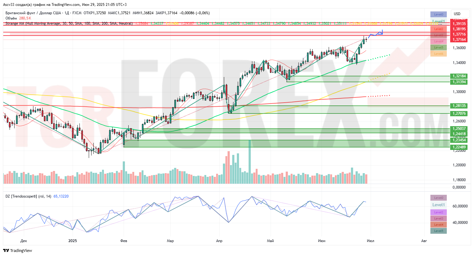 GBP/USD находится у отметки 1,37164, продолжая рост в рамках восходящего тренда. Пара тестирует важное сопротивление, что требует повышенного внимания.