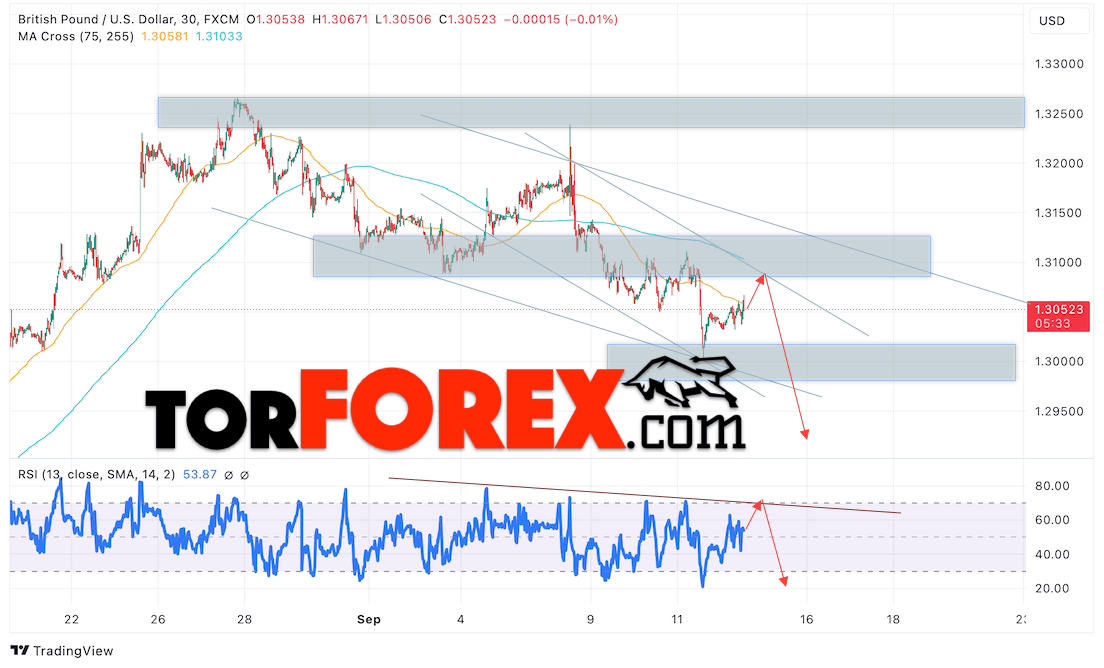 Таким образом, GBP/USD прогноз Британского Фунта на 13 сентября 2024 предполагает попытку теста области сопротивления вблизи уровня 1.3080. Затем, продолжение падения с целью вблизи уровня 1.2925. Дополнительным сигналом в пользу снижения Британского Фунта выступит тест линии сопротивления на индикаторе относительной силы (RSI). Отменой варианта падения станет сильный рост Британского Фунта против Доллара США и пробой области 1.3165. Это укажет на продолжение подъёма на Форекс пары с потенциальной целью выше уровня 1.3285.