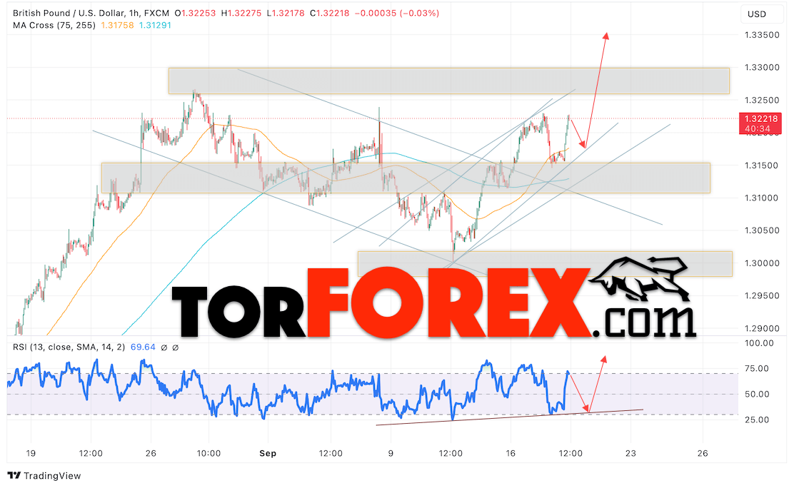 Валютная пара Фунт Доллар GBP/USD продолжает движение в рамках развития роста и бычьего канала. В момент публикации прогноза курс Фунта к Доллару США на Форекс составляет 1.3221. Скользящие средние указывают на наличие краткосрочной бычьей тенденции. Цены пробили область между сигнальными линиями вверх, что указывает на давление со стороны покупателей валютной пары и потенциальное продолжение роста инструмента. На данный момент стоит ожидать попытку развития снижения курса Британского Фунта против Американского Доллара и тест области поддержки вблизи уровня 1.3175. Откуда вновь стоит ожидать отскок котировок пары вверх и продолжения роста валютной пары Британского Фунта против Доллара США. Целью подъёма пары, в рамках Форекс прогноза, выступает область на уровне 1.3355.