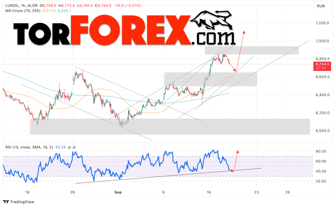 В пользу подъёма стоимости и котировок LKOH выступит тест восходящей линии тренда на индикаторе относительной силы (RSI). Вторым сигналом станет отскок от нижней границы бычьего канала. Отменой варианта роста акций Лукойл выступит снижения котировок актива и пробой уровня 6515. Это укажет на пробой нижней границы бычьего канала и продолжение падения котировок LKOH в область ниже отметки 6265. Подтверждением подъёма цен и курса акции выступит пробой области сопротивления и закрытие выше уровня 6845.