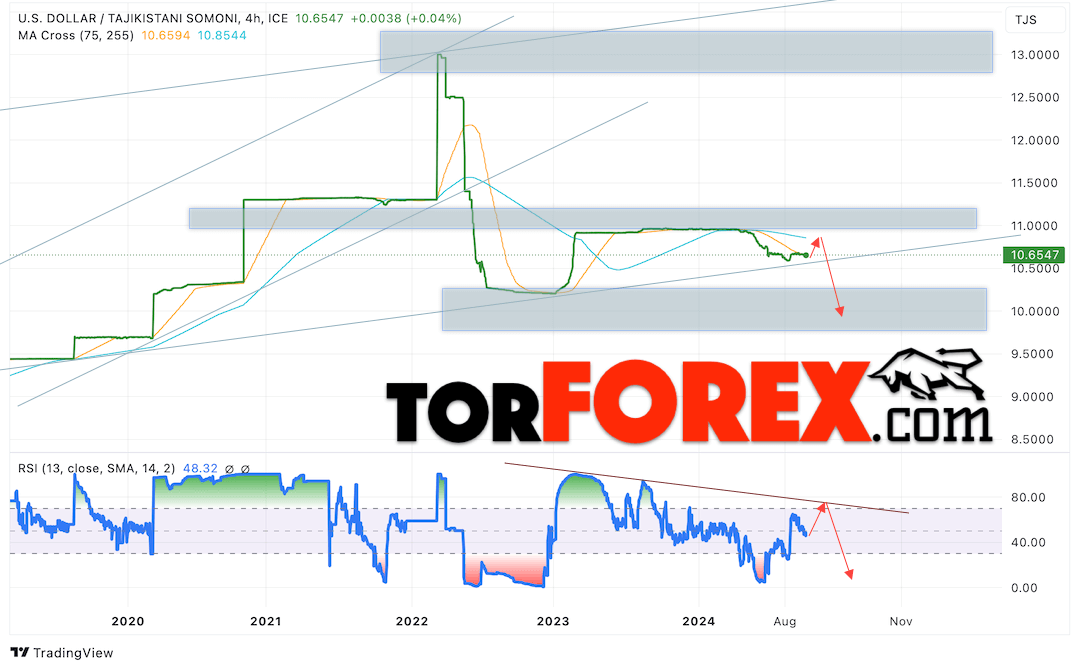 Таким образом, Сомони прогноз на сегодня 25 сентября 2024 предполагает попытку теста уровня сопротивления вблизи области 10.75. Откуда стоит ожидать отскок и продолжения падения курса Доллара США против Таджикского Сомони с целью ниже уровня 10.05. Дополнительным сигналом в пользу снижения пары выступит тест линии тренда на индикаторе относительной силы. Отменой варианта падения станет пробой области сопротивления и закрытие котировок выше уровня 11.15. В таком случае стоит ожидать продолжения подъёма курса доллара США против Сомони к уровню 12.45.