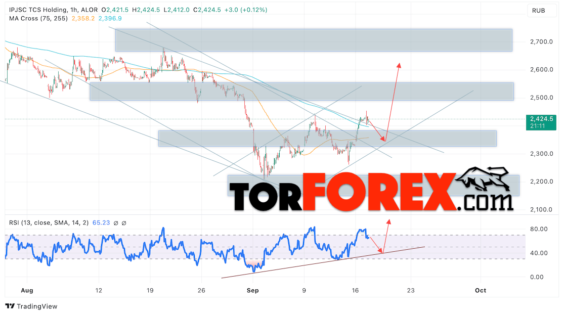 Котировки акций TCS Group торгуется вблизи отметки 2424. Бумага продолжает движение в рамках роста и покинула пределы нисходящего канала. Скользящие средние указывают на наличие медвежьей тенденции по акциям компании. Цены вновь тестируют область между сигнальными линиями, что указывает на давление со стороны продавцов актива и потенциальное продолжение развития нисходящей тенденции. В рамках прогноза курса и стоимости Тинькофф на 18 сентября 2024 стоит ожидать попытку коррекции и тест уровня поддержки вблизи области 2345. Откуда стоит рассматривать отскок вверх и продолжение подъёма курса акций с целью выше уровня 2615.