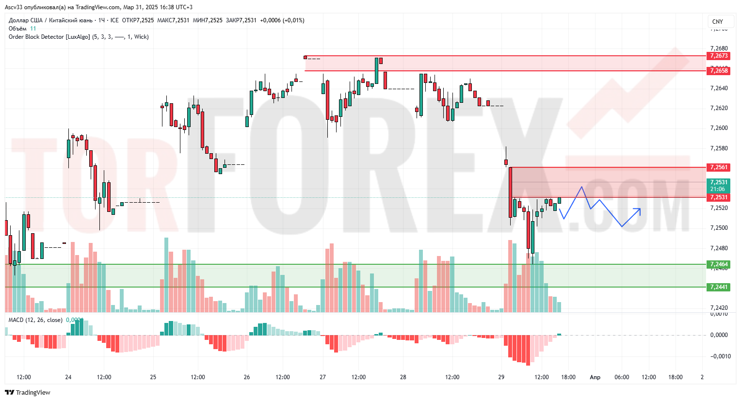 Пара демонстрирует признаки формирования базы после падения. В ближайшие часы критическим ориентиром станет поведение в зоне 7,2440–7,2650. До выхода за пределы этого диапазона возможны боковые колебания с уклоном в сторону накопления позиций.