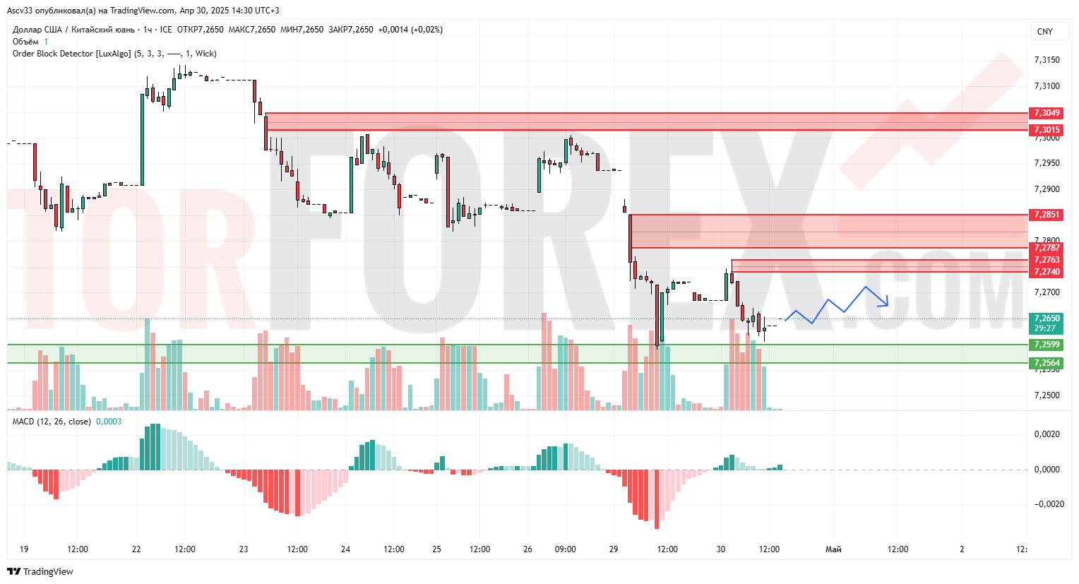 Вероятна консолидация в диапазоне 7,2564–7,2740. Отскоки к верхней границе зоны сопротивления могут использоваться продавцами. Пробой ниже 7,2564 откроет путь к более глубокой коррекции.