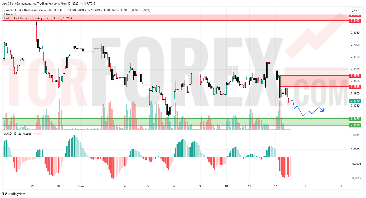 Пара USD/CNY продолжает демонстрировать признаки слабости после резкого отката от зоны сопротивления 7,1875. Нисходящий импульс усилился после пробоя локальных минимумов, указывая на возможное дальнейшее снижение.