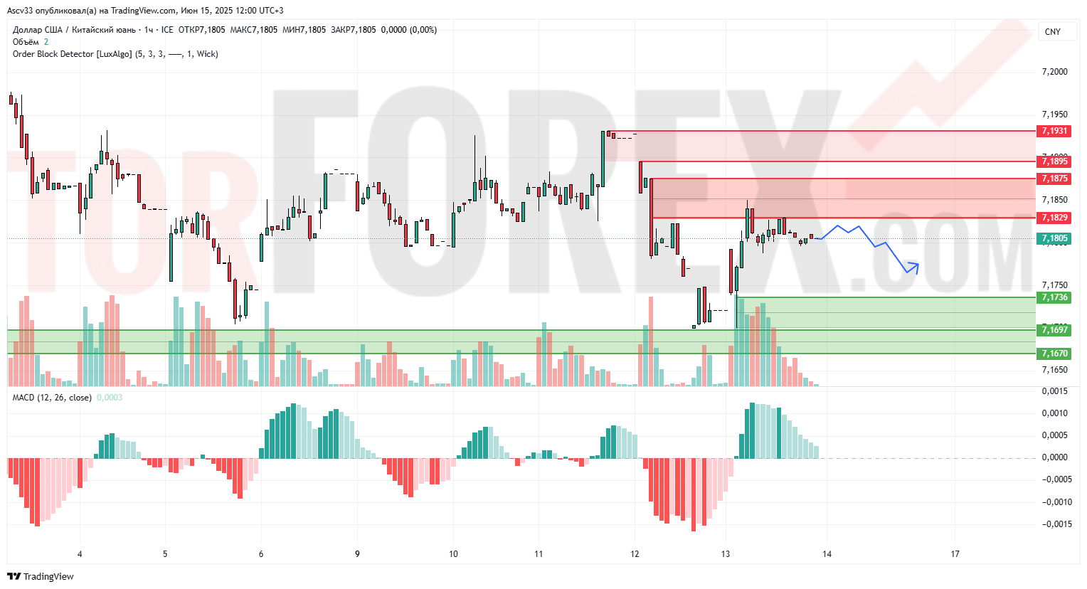 Пара USD/CNY торгуется ниже зоны предложения и демонстрирует признаки ослабления после локального отката вверх. Общая структура остаётся медвежьей: резкий откат 13 июня не получил продолжения, и цена консолидируется под сопротивлением. Текущая динамика указывает на вероятное возобновление снижения.