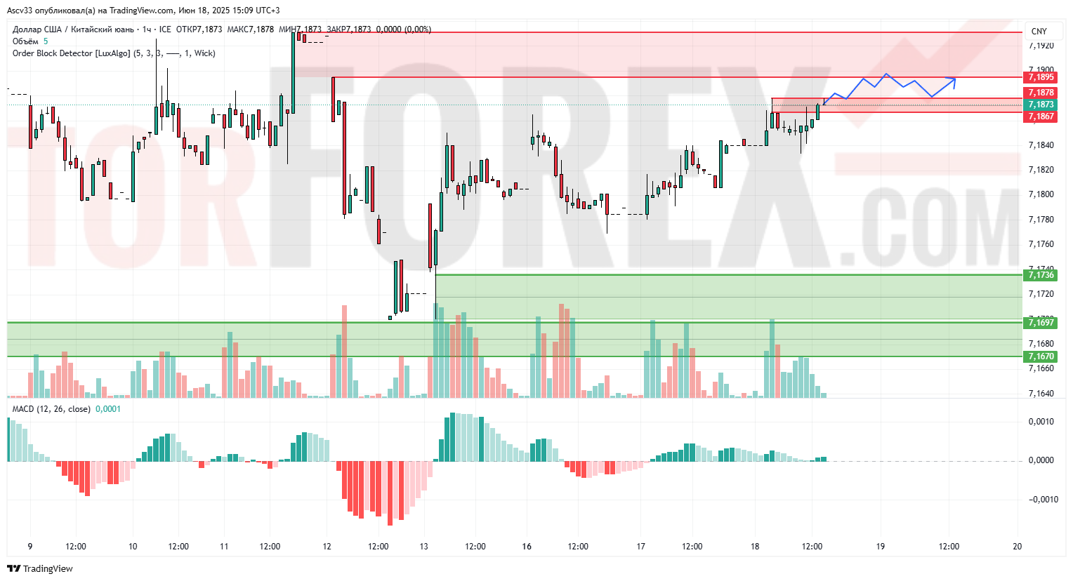 Ожидается продолжение боковой динамики в пределах диапазона 7,1860–7,1895. Устойчивый пробой выше 7,1895 подтвердит настрой на дальнейший рост. В противном случае высока вероятность отката в сторону 7,17.