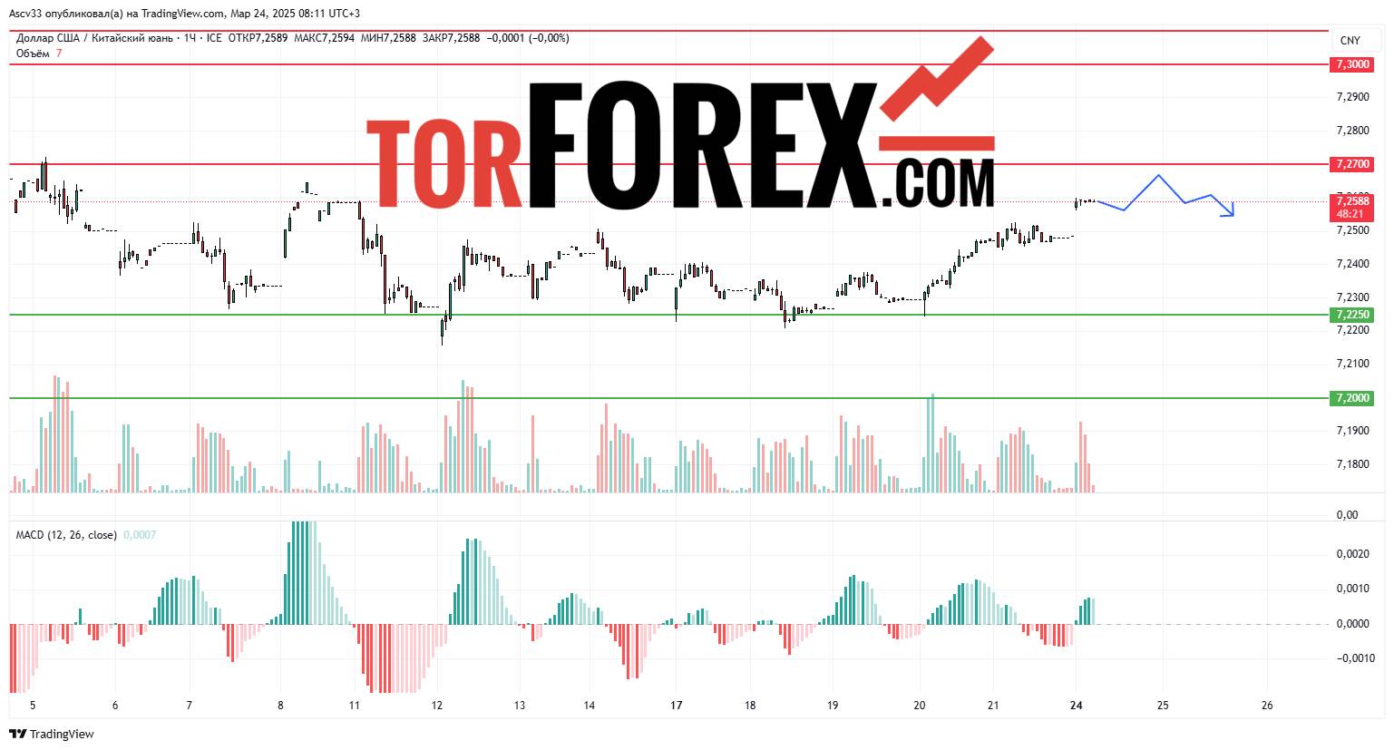 Ожидается, что USD/CNY будет находиться в диапазоне 7,2250–7,2700 в течение 24 марта. Пробой 7,2700 вверх подтвердит бычье движение, тогда как закрытие ниже 7,2250 может усилить медвежьи настроения. Трейдерам следует внимательно отслеживать изменения вблизи этих ключевых уровней, поскольку их прорыв может оказать значительное влияние на стратегии на рынке.