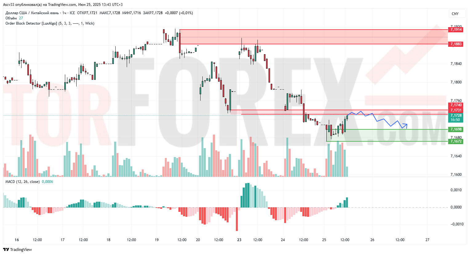 Ожидается консолидация в диапазоне 7,1670–7,1740 с вероятным постепенным снижением. Если продавцы активизируются, возможно возобновление нисходящего тренда к 7,1670 и ниже. Пробой выше 7,1740 откроет дорогу к тесту 7,1880, но пока сценарий умеренно негативный.