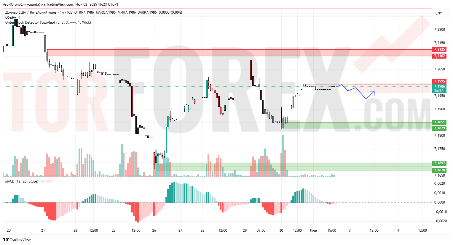 Ожидается колебание в пределах 7.1995–7.1829 с приоритетом формирования нисходящей коррекции. При пробое 7.1995 рост может продолжиться в сторону 7.2100.