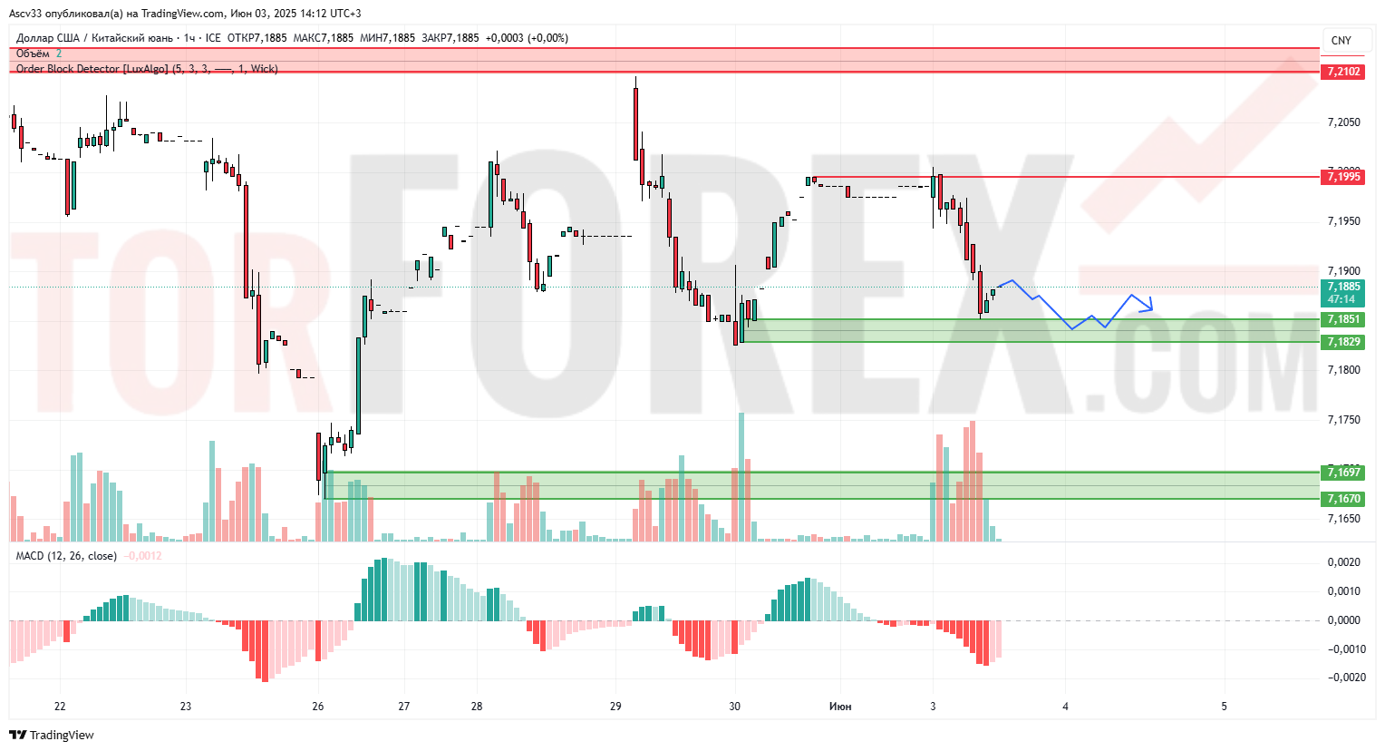 При сохранении давления продавцов вероятно постепенное снижение к зоне 7.1850–7.1829. В случае её пробоя следующей целью может стать область 7.1697. Только возврат выше 7.1995 позволит говорить о смене краткосрочного импульса.