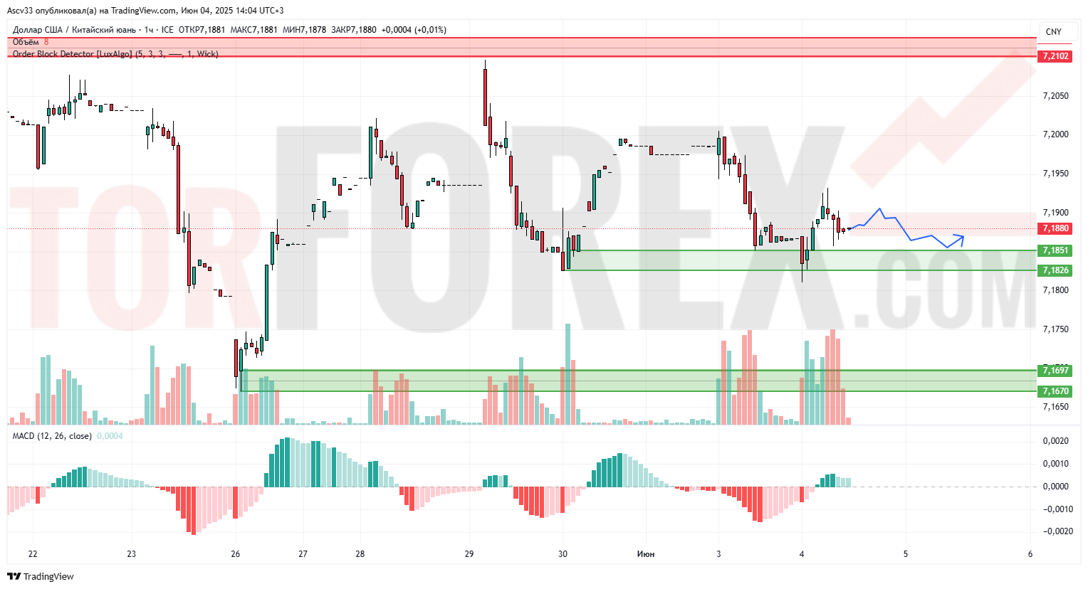 Наиболее вероятен сценарий боковой динамики между 7.1995 и 7.1826 с приоритетом вниз. При пробое ниже 7.1826 возможен откат к 7.1697.