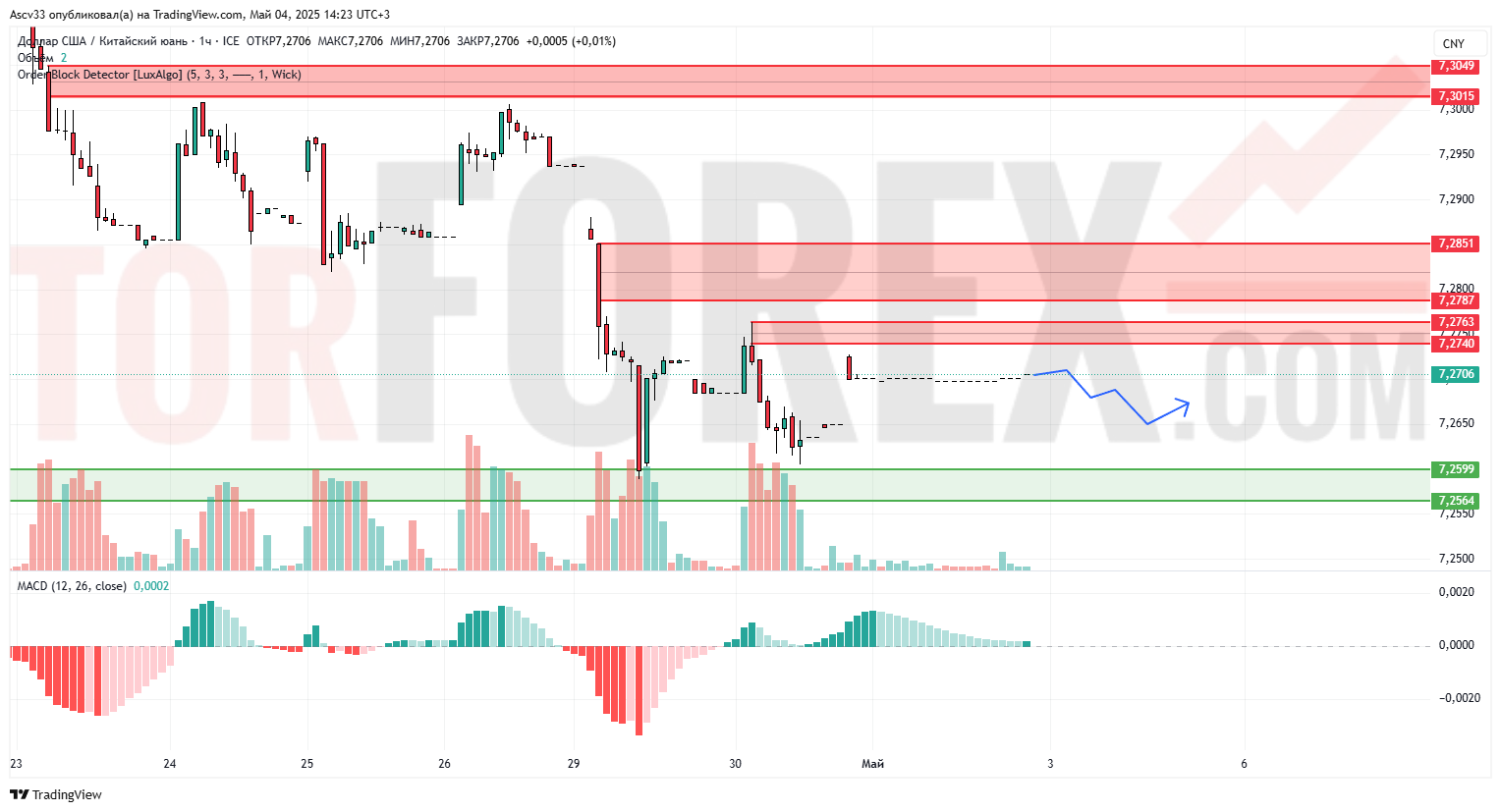 Ожидается боковое движение с поддержкой в районе 7,26 и сопротивлением у 7,2740. При удержании выше поддержки возможна попытка роста к 7,2760–7,2780, но без сильного импульса дальнейшее развитие ограничено.