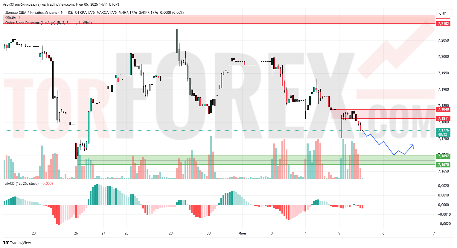 Ожидается дальнейшее снижение в зону поддержки 7,1697–7,1670. После достижения этой области возможно краткосрочное восстановление, однако при сохранении давления продавцов следующей целью может стать 7,1600.