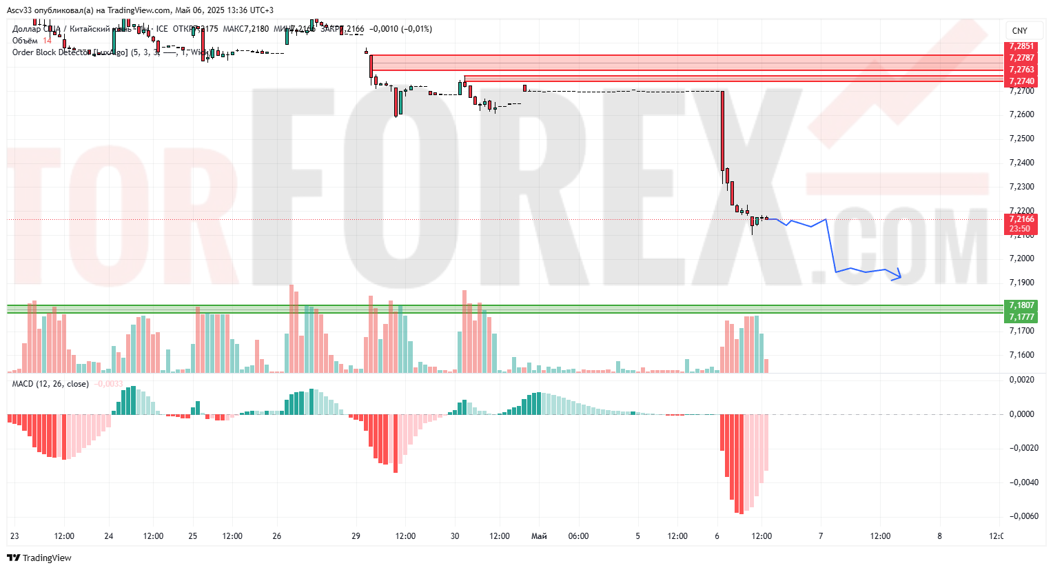 Ожидается консолидация с дальнейшим снижением в сторону 7,18 и ниже. Восстановление возможно только при возврате выше 7,24, но пока таких признаков нет. Медвежий сценарий остаётся приоритетным.