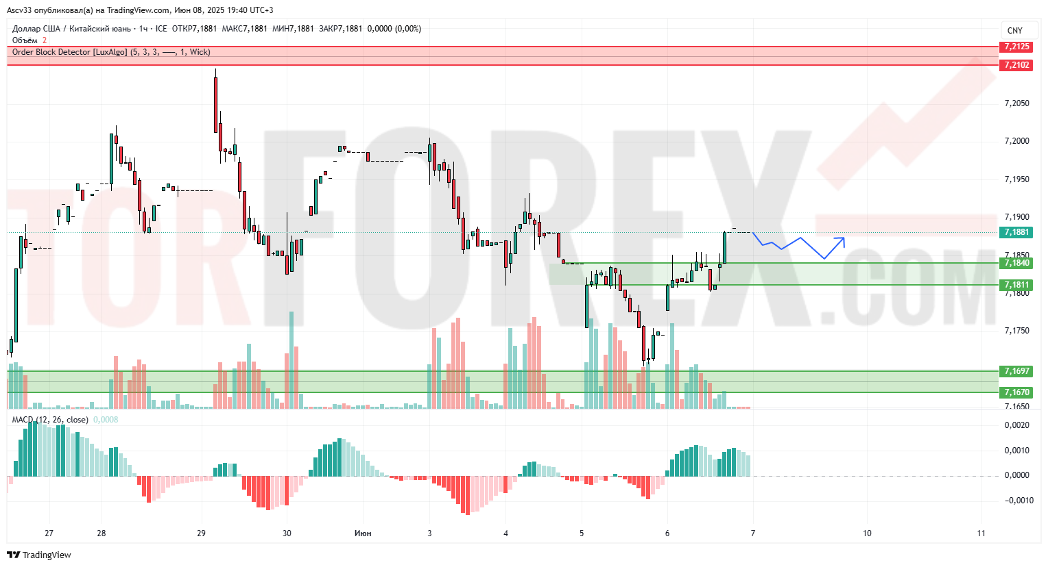 7,1811–7,1840 — зона спроса, пробитая вверх, теперь выполняет функцию поддержки.